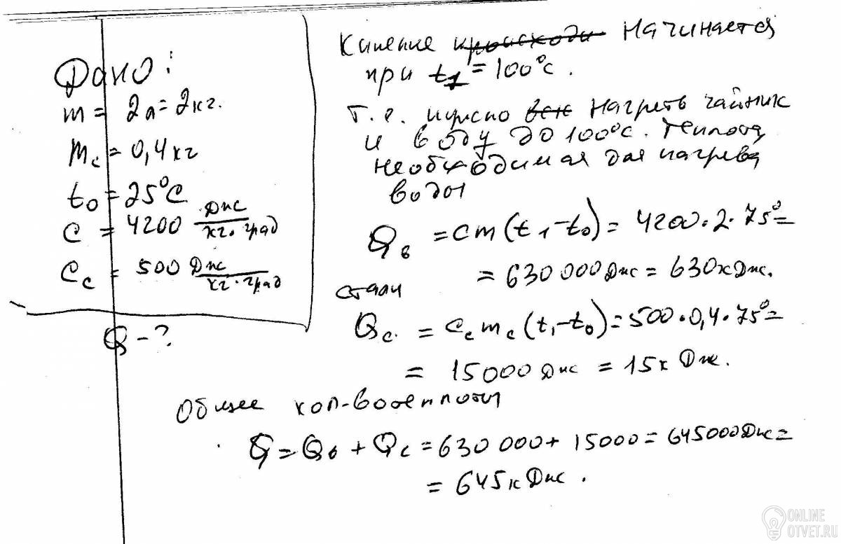 Сколько тепла потребуется для того,чтоьы вскипятить 2 литра воды ,налитой в электрический стальной чайник массой 400 г?Начальная температура воды и чайника 25°С.Удельная теплоемкость стали 500Дж/(кг•град).