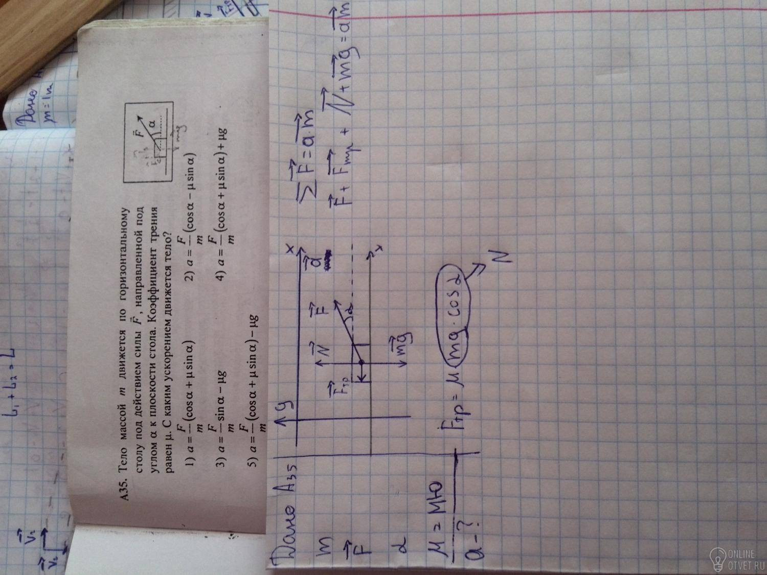 Тогда: a = (Fcosα - μmg + μFsinα)/m = (F(cosα + μsinα))/m - μg
