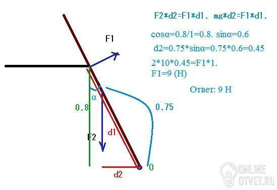 Однородную палку длиной 1.5м и моссой 2 прислонили к краю стола так, что расстояние от верхнего конца палка до точки касания равняет равняется 50 см. Высота стола равна 0.8м. Пренебрегая трением между палкой и столом, найдите силу их взаимодействия