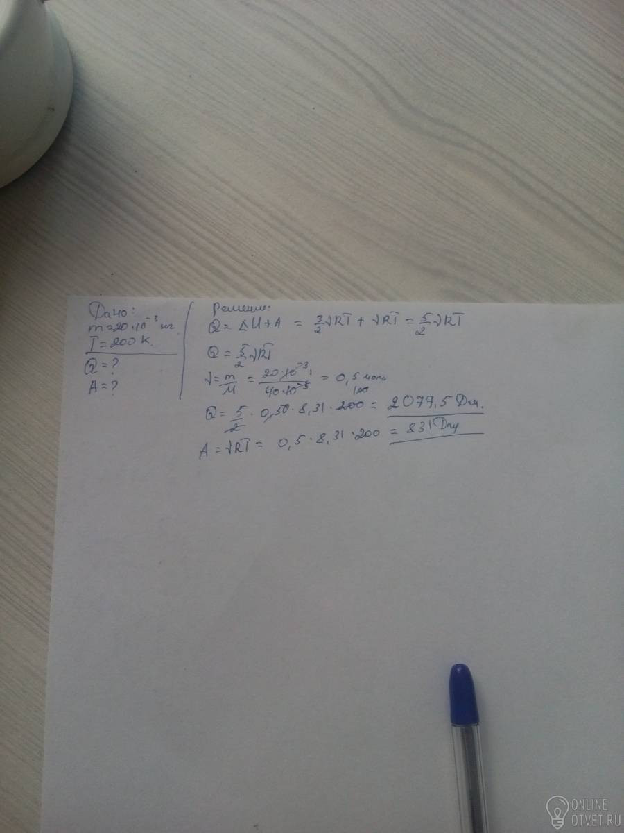 Аргон массой m=20 г , нагрет на 200 K при постоянном давлении . Определить 1. Количество теплоты , переданное газу .2. Работу , совершенную при расширении