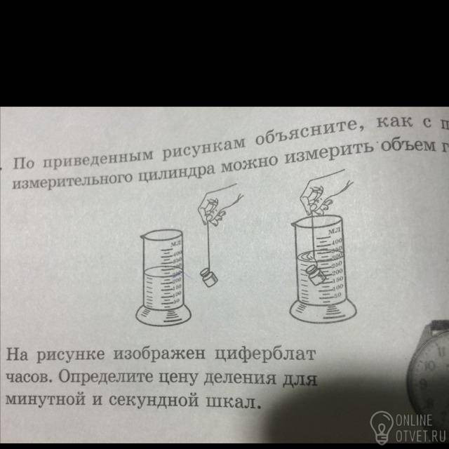 Наливаем определенное количество воды в измерительный цилиндр. Потом опускаем туда гирьку. От полученного объема воды с гирькой отнимаем изначальный объем воды.