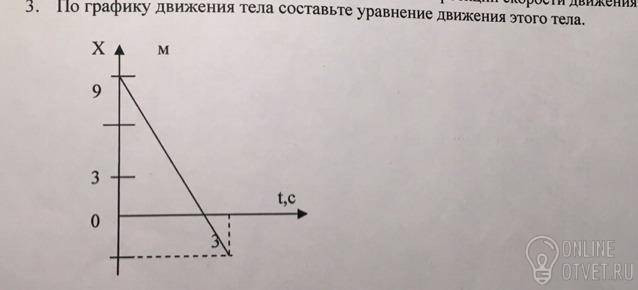 Движение равномерное, т.к. координата X меняется со временем одинаково. Для равномерного движения уравнение движения x(t)=x0+Vxt, где x0- начальная координата, Vx- скорость тела, t- время. у нас всё есть по сути, кроме Vx, то есть скорости. Её можем найти по формуле Vx=(x-x0)/t. По этой формуле у нас получается Vx=(-3-9)/3, то есть Vx=-12/3=-4. Подставляем в уравнение движения и радуемся жизни: x(t)=9-4t.