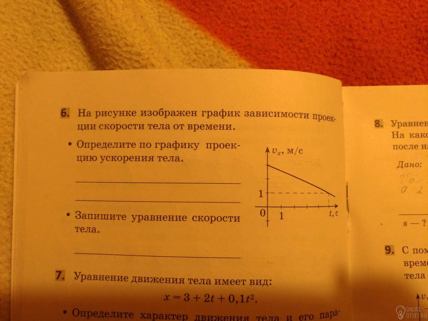 уравнение скорости Vx=Vox +at, Vx=3 - 0,4t