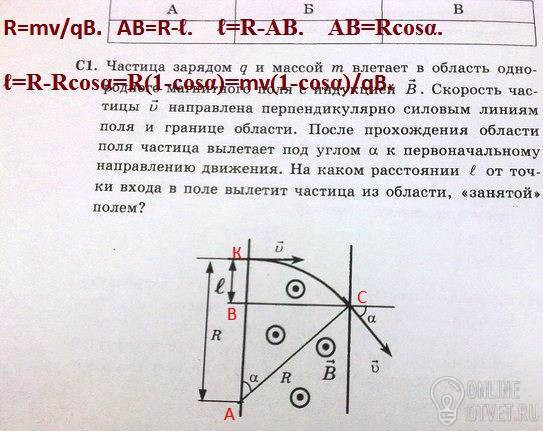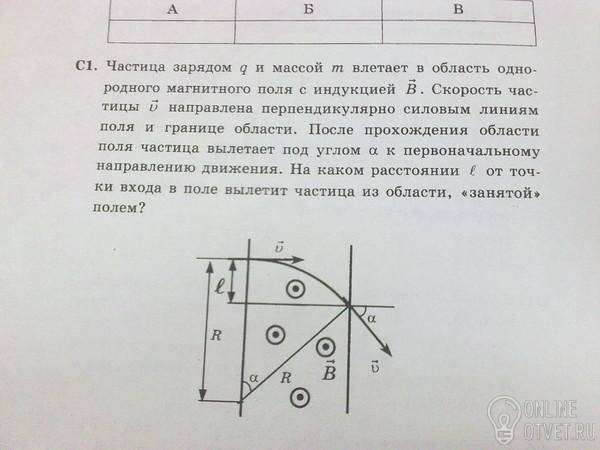 Частица зарядом "q" и массой "m" влетает в область однородного магнитного поля с индукцией "B". Скорость частицы "V" направлена перпендикулярно силовым линиям поля и границе области. После прохождения области поля частица вылетает под углом "a" к первоначальному направлению движения. На каком расстоянии "l" от точки входа в поле вылетит частица из области, "занятой" полем?