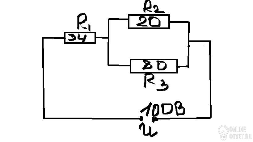 Сначала находим общее сопротивление цепи, R=R1+ (R2*R3)/(R2+R3)=34+(20*80)/20+80=34+16=50 Ом, знаая, что U=100 В из закона Ома находим I=U/R=100/50=2A, значит ток и на первом и на 2и 3 сопротивлениях 2А (оба участка цепи соединены последовательно, а напряжение можно найти, как сумму напряжений на первом сопротивлении и 2и3, значит U=U1+U23, U23=U-U1, U1=I*R1=2*34=68B, U23=100-68=32 B, это напряжение будет одинаковым для 2 и 3 сопротивлений, т.к. они соединены параллельно (законы параллельного и последовательного соединений проводников), значит I2=U23/R2=32/20=1.6 A