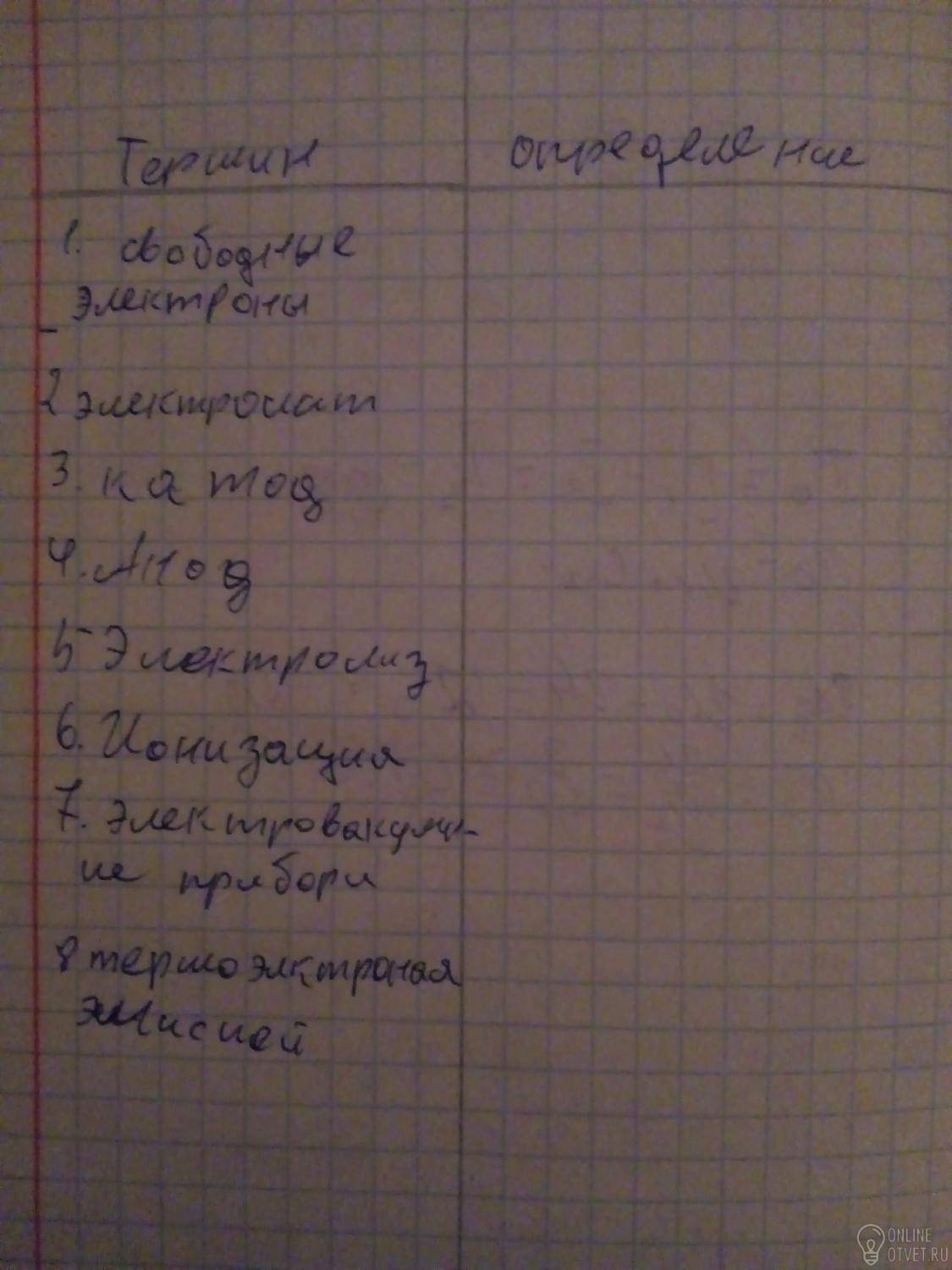 1.Свободный электрон-это электрон, как правило, потерявший связь со своим атомом.2.Электролиты — это вещества, растворы или расплавы которых проводят электрический ток.. 3. Катод - это всегда отрицательный электрод (МИНУС). 4. Анод - это положительно заряженный электрод (ПЛЮС). 5.Электролиз – это совокупность процессов, протекающих в растворе или расплаве электролита, при пропускании через него электрического тока. 6