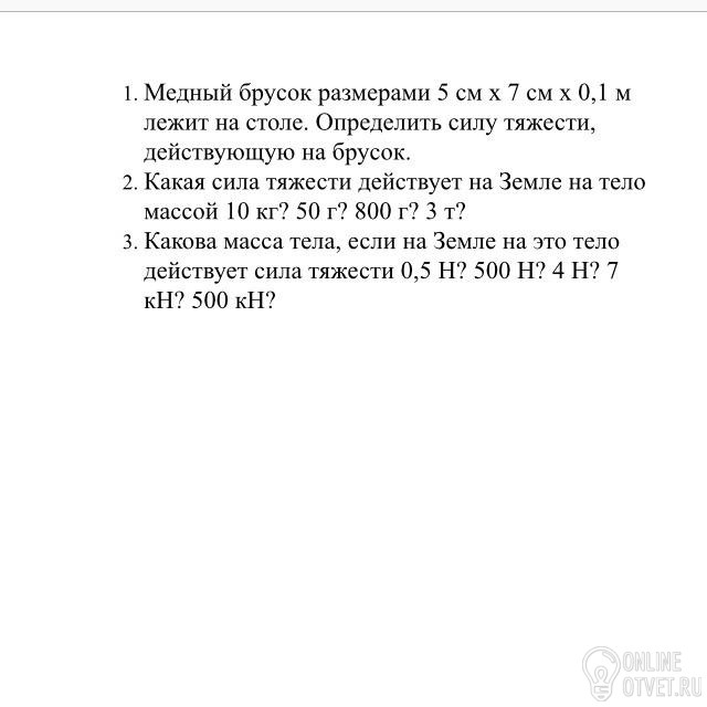 1) масса бруска=плотность меди* объём бруска, m=ρ*V. V=5*7*10=350 см³. ρ=8,92 г/см³. Теперь масса равна m=8,92*350=3122 г=3,122 кг. Сила тяжести равна F=m*g=3,122*9,8=30,596 Н. Здесь g - ускорение св. падения.