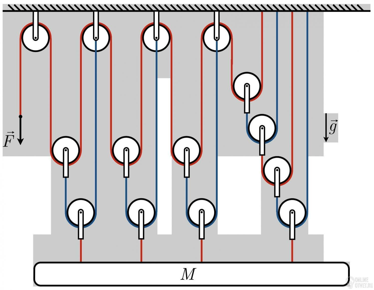 Для удержания очень тяжёлой металлической балки используется система блоков и тросов, прикреплённых к горизонтальной части подъёмного крана, как показано на рисунке.