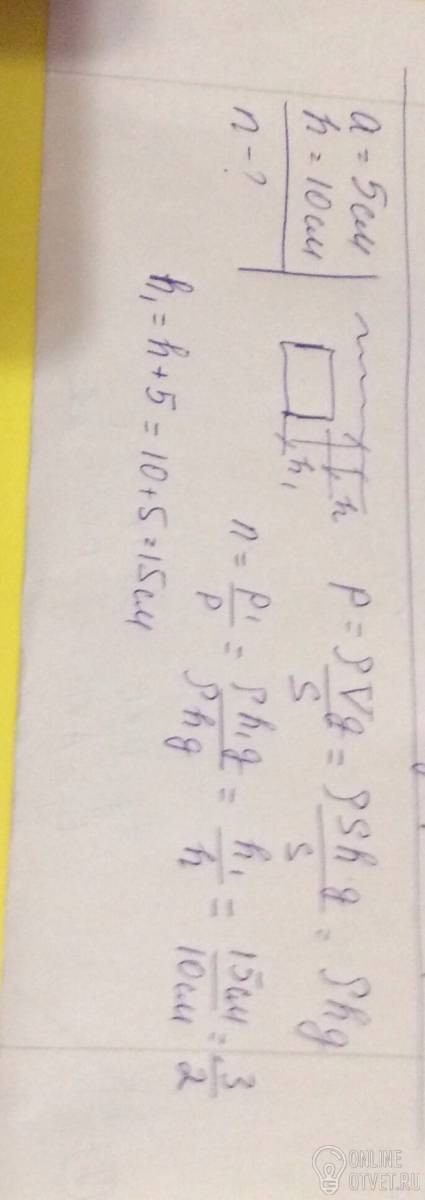 Медный кубик со стороной a=5,0 см находится в толще воды, причем верхняя грань распологается на глубине h=10 см от поверхности. Во сколько раз n отличаютсч силы давления, действующие на нижнюю и верхнюю грань кубика