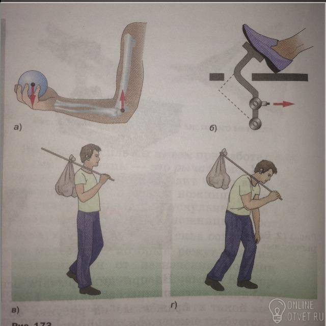 Где картинка с рукой и шаром точкой опоры является кость на которой стрелка вверх а плечом оставшаяся часть конечность с грузилом в виде шара!