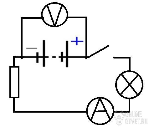 Начертите схему электрической цепи,состоящей из последовательно соединенных элементов:батарея гальванических элементов,ключ,резистор,электрическая лампа.Добавьте в схему амперметр,измеряющий силу тока в лампе,и вольтметр,подключенный к батарее гальванических элементов.