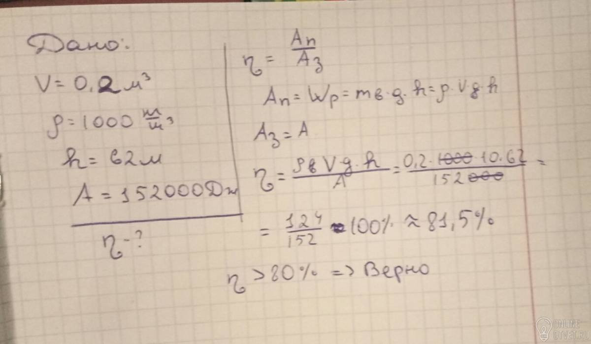 По расчетам инженера насос,поднимая 200 л воды с глубины 62 м,совершит 152кДж работы.Верно ли,что КПД насоса в этом случае составит более 80%?