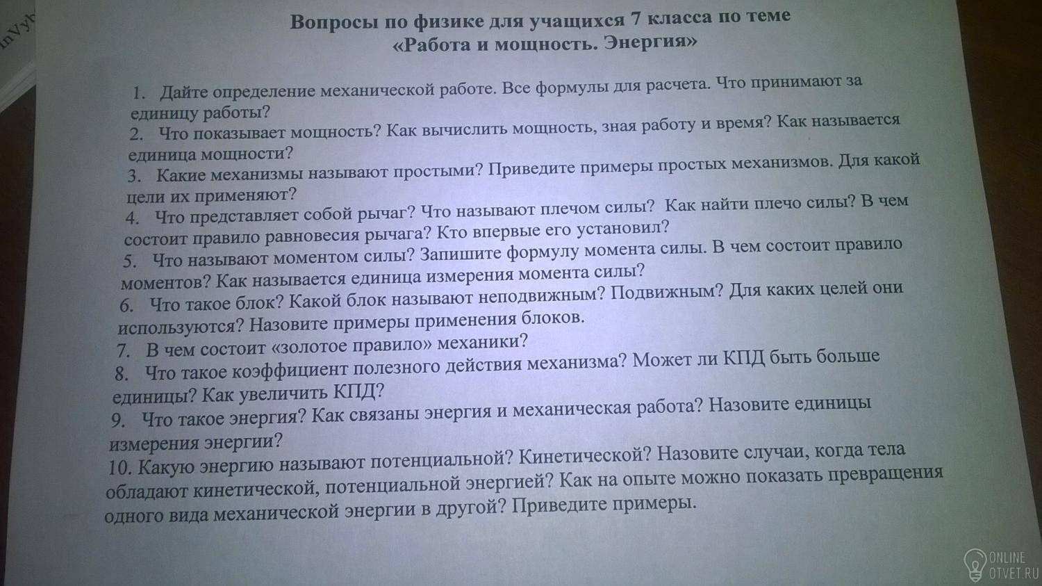 1.Механическая работа(А) совершается тогда,когда на тело действует сила и оно движется.А=F*S. F-cила тяжести,Sперемещение тела, под действием силы.Измеряется в Джоулях.