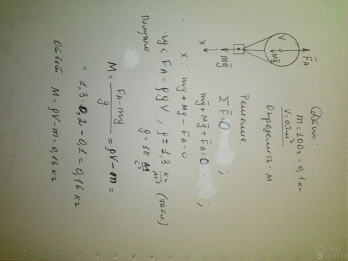 Тело летит на воздушном шаре. вычислите архимедову силу, действующую на шар, если его объем составляет 0,2 м3. найдите массу воздушного шара, если масса тела 100 г.