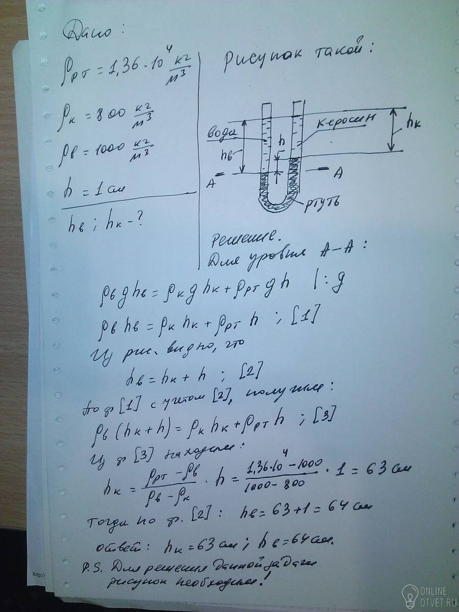 В U-образной трубке находятся ртуть,вода и керосин (Ртуть находить по середине,на дне, а вода и керосин по бокам) . Найдите высоту столбов воды и керосина, если в правом колене трубки уровень ртути на h= 1 см выше, чем в левом. (В левом вода, а в правом керосин)