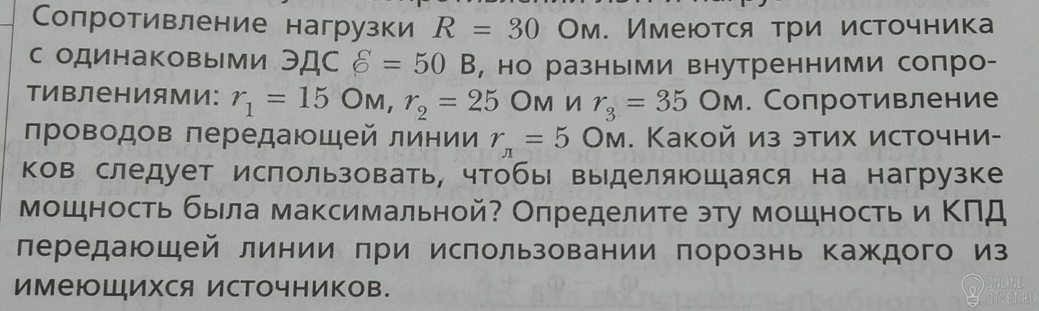 По закону Ома для полной цепи ток в цепи: I=E/(R+r+rл), где rл- сопротивление линии. Выделяющаяся на нагрузке мощность P=IRR. Она максимальна при минимальном r, а именно при r=r1=15 ом. КПД равен отношению выделяемой на нагрузке мощности к мощности эдс.