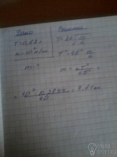 Умоляю решите подробно! Период колебаний груза на пружине жесткостью 10^3 Н/м равен 0,62 с. Какова масса этого груза?