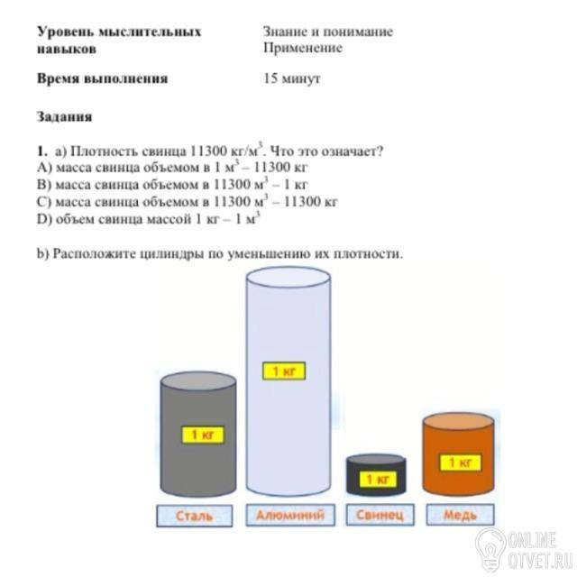 b) Свинец, медь, сталь, алюминий (Так как масса данных цилиндров одинаковая, смотрим на объём. Чем больше объём цилиндра, тем меньше его плотность)