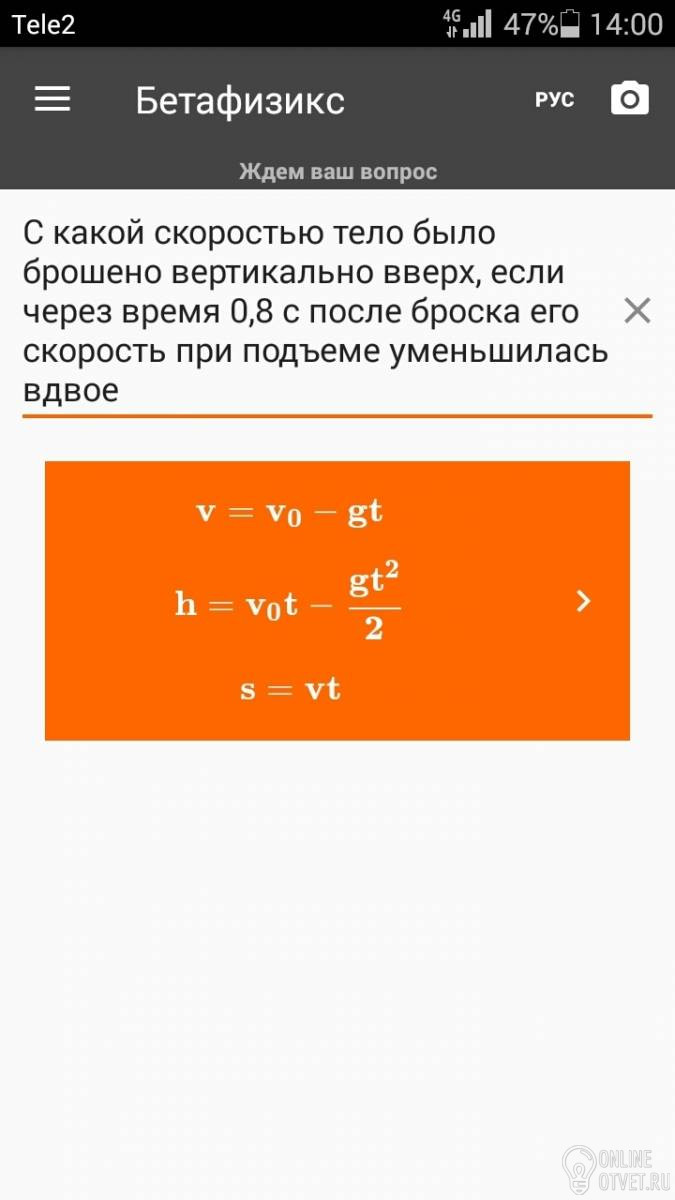С какой скоростью тело было брошено вертикально вверх, если через время 0,8 c после броска его скорость при подъеме уменьшилась вдвое