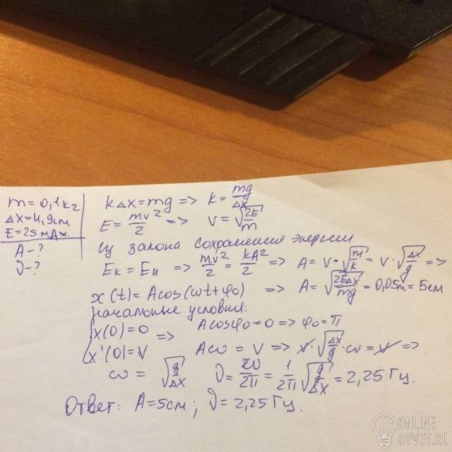 Помогите пожалуйста. Под действием груза массой 100 г пружина растягивается на 4,9см. Грузу сообщили кинетическую энергию 25 мДж, и он стал совершать гармоническое колебание. Определить частоту и амплитуду колебаний.
