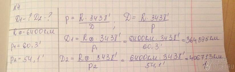 Как изменится расстояние до Луны при ее движении по эллиптической орбите вокруг Земли, если считать, что горизонтальный параллакс Луны колеблется от 60,3' (в перигее) до 54,1' (в апогее)?