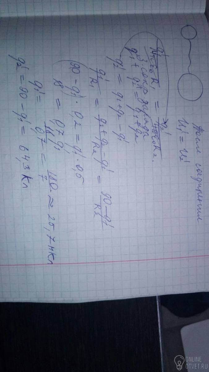 Две металические сферы радиусами R1=20 cm и R2=50 cm имеют заряды q1=40 мКл и q2=50 мКл. Найдите заряды сфер q'1 и q'2 после их соединения тонким проводником.