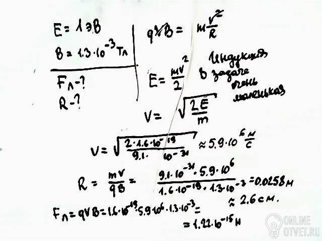 В магнитное поле, образованное в вакууме, перпендикулярно линиям индукции влетают электроны с энергией 1 эВ. Индукция поля 1,3 * 10^-3 Тл. Вычислить силу Лоренца и радиус траектории движения электронов.