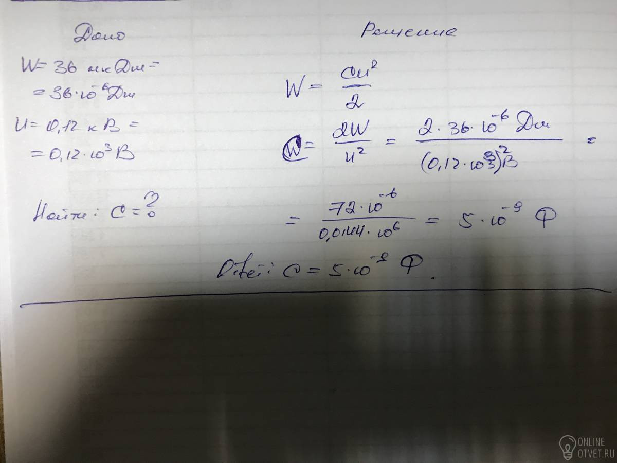 Определите электроемкость конденсатора энергия электростатического поля которого W=36мкДж,а напряжение между обкладками U=0,12кВ