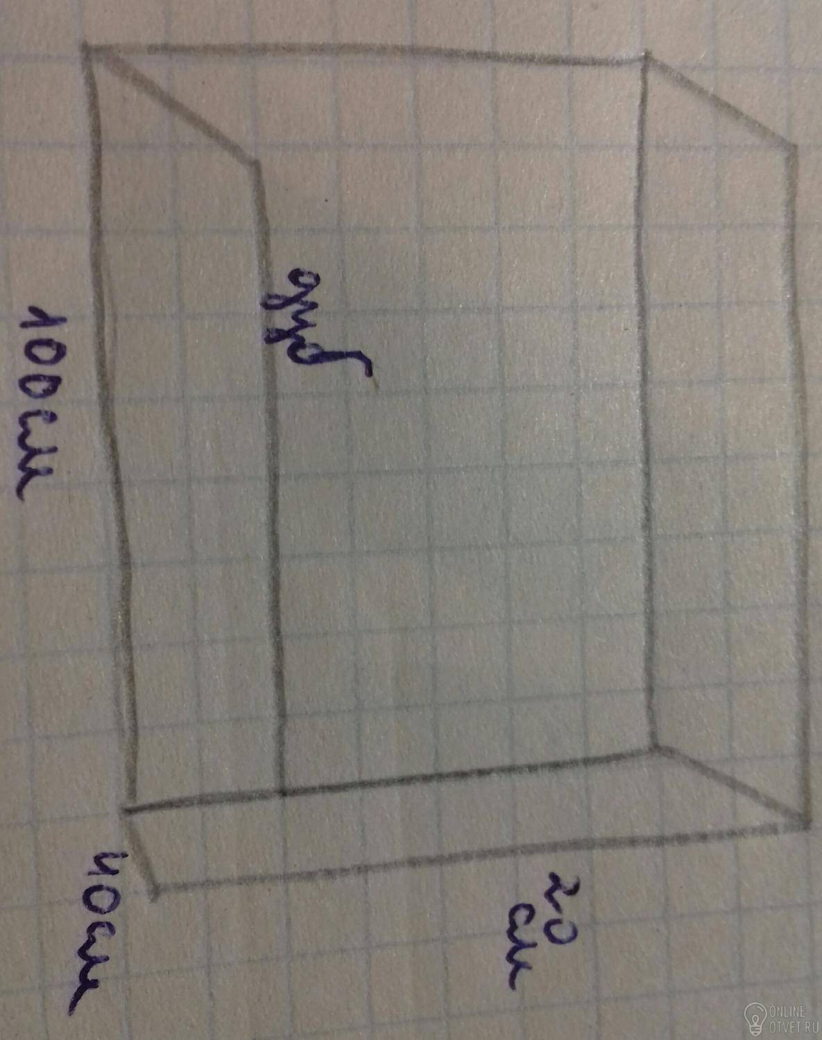 V=a*b*h объем a=100 см=1 м b=40 см=0,4 м h = 20 см=0,2 м