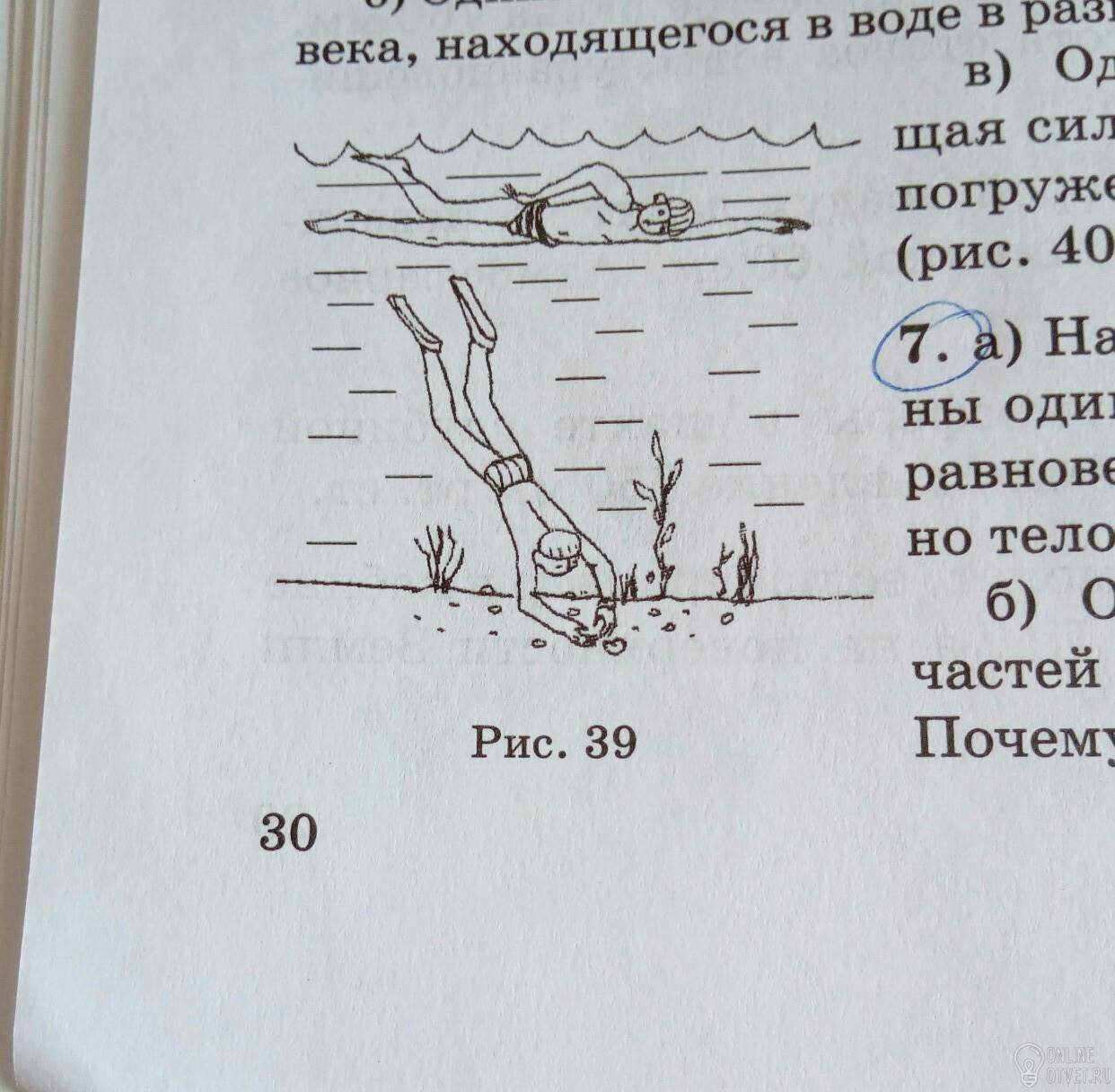 1. Так, к примеру, человек, плывущий брасом на картинке, лишь наполовину погружен в жидкость, в то время как человек, занимающийся дайвингом, полностью погружен в жидкость. Это значит, что величина V у них различная.