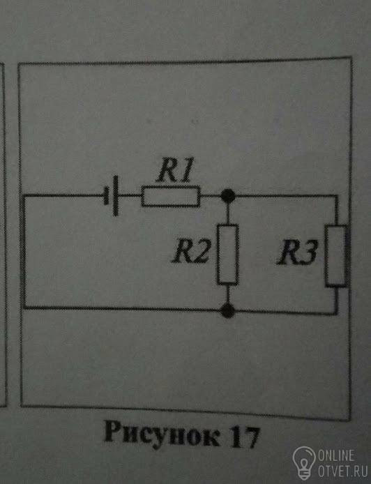 2.Рассчитайте силу тока,протекающего через резистор R₃,если сопротивления резисторов R₂=R₃=6 Ом,R₁=5 Ом(рисунок 17),а ЭДС источника тока равна 18 В.Внутреннее сопротивление источника тока равно 1 Ом.
