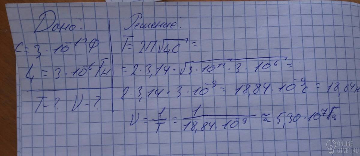 Найти период и частоту колебаний в контуре,состоящем из конденсатора ёмкостью =3 пФ и катушки индуктивностью =3мкГн