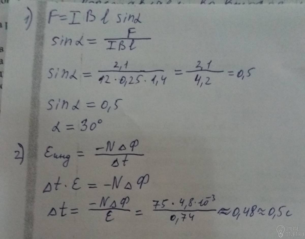 1. В однородном магнитном поле с индукцией 0,25 Тл находится прямолинейный проводник длиной 1,4 м, на который действует сила 2,1Н. Определить угол между направлением тока в проводнике и направлением магнитного поля, если сила тока в проводнике равна 12А?