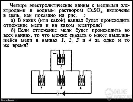 2) в ваннах 2 и 3 меди выделится в два раза меньше, так как при параллельном соединении сила тока в ваннах в 2 раза меньше, чем в ваннах 1 и 4