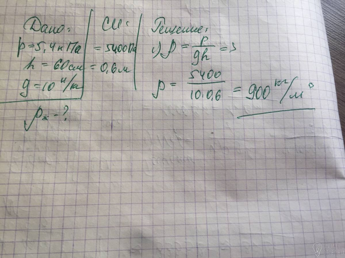 Определите плотность жидкости в баке, если на глубине 60 см она оказывает давление 5,4кПа