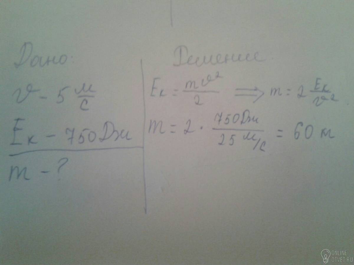 Визначити масу лижника , якщо він, рухаючись зі швидкістю 5м/с, має кінетичну енергію 750Дж ДОПОМОЖІТЬ