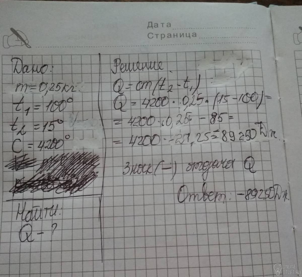 Какое количество теплоты отдаст стакан кипятка, объемом 250 мл, остывая до температуры 15 °С?