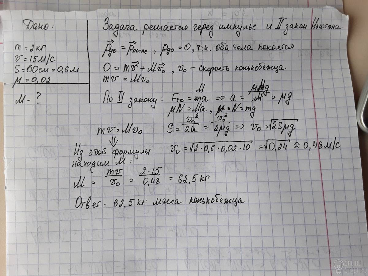 Конькобежец стоя на коньках на льду, бросает в горизонтальном направлении предмет массой 2 кг со скоростью 15 м/с относительно льда, и откатывается в обратном направлении на 60 см. Найдите массу конькобежца, если коэффициент трения коньков о лёд равен 0.02.помогите плс