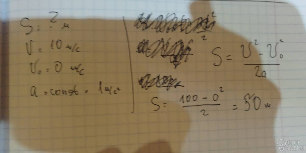 Определите путь,пройденный телом от начала движения,если оно в конце пути имело скорость 10м/с,а ускорение постоянно и равно 1 м/с 2