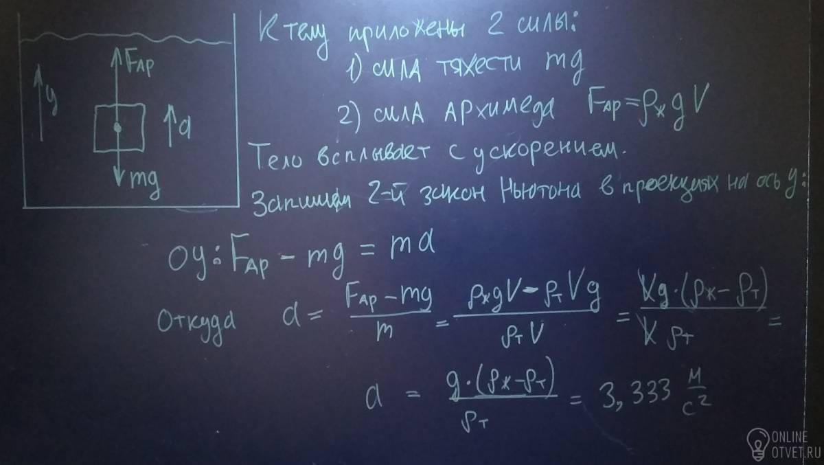 В жидкости плотностью 1000 кг/м3 всплывает тело плотностью 750 кг/м3. Каким было бы ускорение всплывающего тела (м/с2) при отсутствии сопротивления его движению?