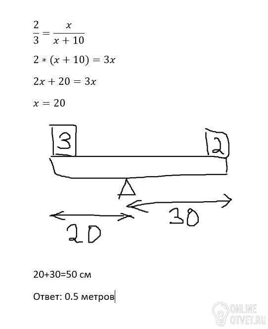 Лёгкий рычаг, к концам которого подвешены грузы массами 2 и 3 кг, находится в равновесии. Определите (в метрах) длину рычага, если одно его плечо на 10 см длиннее второго.