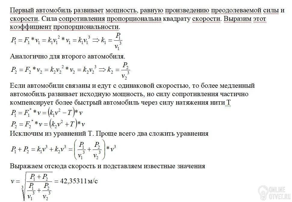 Два автомобиля с максимальными мощностями двигателей 120 кВт и 135 кВт могут развивать максимальные скорости 40 м/с и 45 м/с соответственно. Какую максимальную скорость смогут развить при тех же условиях эти два автомобиля, связанные буксирным тросом? Считать, что скорость автомобиля ограничена сопротивлением воздуха (аэродинамический предел). Сила сопротивления воздуха, действующая на каждый автомобиль, пропорциональна квадрату скорости. Ответ округлить до целых.