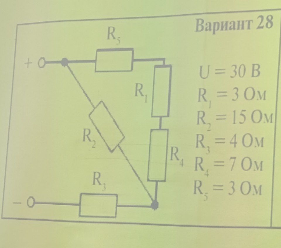 R1=3 Oм, R2=15 Ом, R3=4 Ом, R4=7 Ом, R5=3 Ом, U=30 В