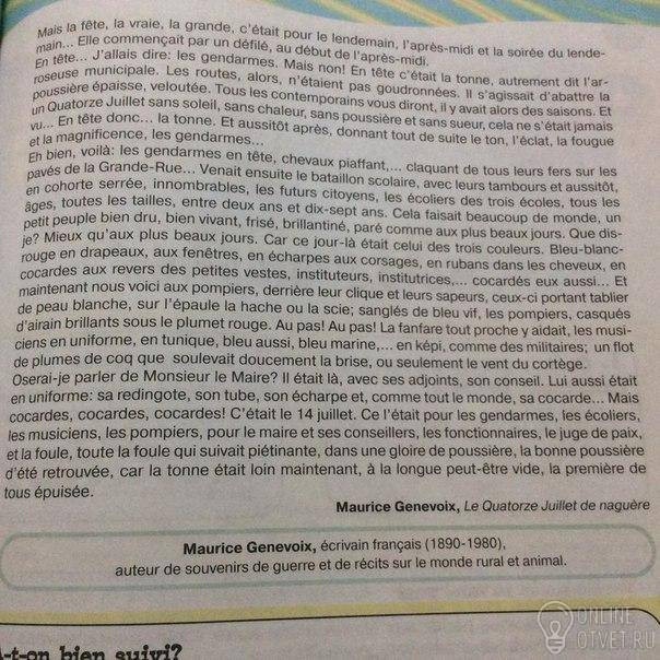 Ну ладно, так вот: жандармы на вершине... лошади бьют копытами о землю, ... цокая всей силой своими копытами о тротуары Главной улицы.... Проходил также школьный батальон с их барабанами и тотчас в тесном когорте, бесчисленные, будущие граждане, школьники трёх школ, одного возраста, одного роста, между двух и семнадцати лет. Было много людей, самое маленькое поколение, самые сильные, самые живые, подвижные, блестящие, одетые, как на самый лучший день. Что я скажу? Лучше, чем на самый лучший день. Потому что этот день был только трёхцветный. Синий-белый-красный на всех флагах, на всех окнах, завязанные на корсеты, завязанные ленточки на волосах, обмотанные с изнанки на маленьких куртках, студенты, студентки.... обмотанные они также... И сейчас мы видим здесь пожарных позади их кликов и их огня, нося впереди белую кожу, на плече топор или пилу; ярко-голубые ленты, пожарники, каски медно-блестящие под красным шлейфом. В ногу! В ногу! Оркестр рядом им помогал, музыканты в униформах, в туниках, голубого цвета также, морского, ... в кепи, как военные; флот с перьями петухов, которые подняли осторожно бриз, или только ветер картежа.