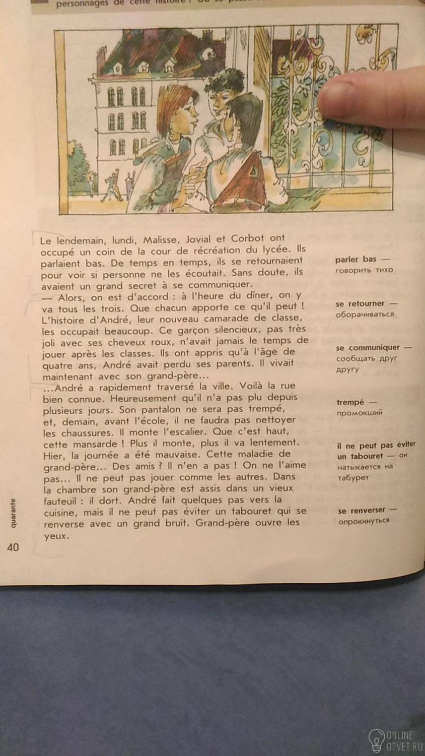 Андрей быстро пересек город. А вот и хорошо знакомая улица. К счастью, он не имел больше ни дня( это предложение не точно, не знаю как перевести). Его штаны не были промокшими, и, завтра, перед школой, ему не придется чистить свои ботинки. Он поднимается по лестнице. Как же высоко этот мансард (чердак)! Он продолжал подниматься и шел все медленнее. Вчера был плохой день. Эта болезнь дедушки... Друзья? У него их не было! Он их не любил... Он не мог играть, как другие. В комнате его дедушка сидит в старом кресле: он спит. Он сделал несколько шагов на кухню, но он натыкается на табурет, который падает с большим шумом. Дедушка открыл глаза.