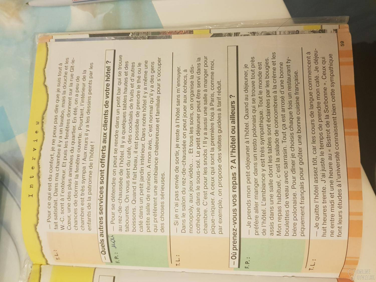 Что касается конфорта, то он удовлетворен. В е не могу сказать, что я все влюблен в свою комнату, есть раковина, но душ и душевые, а затем тенеры выглядят в оживленном районе Гит-л. Мы вряд ли будем спать с открытым окном. Тем не менее, в интерьере дома очень красивые стены есть рисунки, написанные детьми владельца отеля oueis. Другие услуги предлагаются клиентам вашего отеля. Чтобы расслабиться, вы можете пойти в небольшой бар, который расположен на первом этаже отеля. Есть несколько высоких столов и стула. Вам подают кофе, фруктовые коктейли и другие напитки. Когда погода хорошая, в маленьком крытом саду можно есть чай или кофе. В нашем отеле есть даже небольшой конференц-зал. На мой взгляд, это нормально, что есть люди, которые предпочитают теплую и семейную атмосферу, чтобы заботиться о серьезных вещах. Если я не хочу выходить, я остаюсь в отеле без скуки. В гостиной на первом этаже вы можете играть в шахматы, монополии, видеоигры. Каждый вечер дискотека организована в подвале. Завтрак может быть подан в номер. Это для снобов. Существует также столовая для пикника. Для тех, кто впервые в Париже, например, я, например, мы предлагаем экскурсии с пониженной скоростью. или взять еду. В отеле или в другом месте я завтракаю в отеле. Когда я обедаю, я предпочитаю поесть в польском ресторане, расположенном рядом с отелем. Атмосфера очень приятная. Все сидят в комнате, чьи столы освещены свечами. Моя обычная еда - это салат из огурцов со сливками и телячьими шариками с гречкой. Все это запирается хорошим польским пивом. На ужин я выбираю каждый раз, когда в ресторане есть только французский, чтобы отведать хорошую французскую кухню. Я выхожу из отеля рано, потому что занятия по языку начинаются в часах, я просто успеваю выпить кофе. Я, кто не между полуднем и часом у тех, кто учится знать это