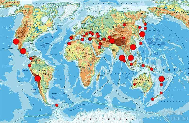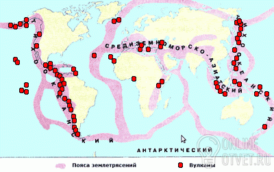 Первая зона – Тихоокеанский пояс. Он охватывает побережье Аляски, Камчатки, западное побережье Северной и Южной Америки, далее тянется к Австралии, проходит через Индокитай, побережье Китая и захватывает Японию Вторая зона – Средиземноморско–Азиатский пояс. Он идёт широкой полосой от Португалии и Испании через Италию, Балканский полуостров, Иран, Кавказ, страны Юго-Западной Азии, через Среднеазиатские республики, выходит к Прибайкалью и далее соединяется на побережье Тихого океана с первым поясом Третья зона проходит по срединным хребтам в Атлантическом и Индийском океанах, где находятся гигантские сейсмически активные зоны. Хребты соединяются друг с другом, а срединный хребет Индийского океана обходит с юга Австралию и соединяется с другим хребтом - Восточно–Тихоокеанским поднятием. Оно тянется на восток к Центральной Америке и затем к Калифорнийскому заливу. Для всей системы хребтов характерна неспокойная геологическая обстановка. Здесь часто извергаются вулканы, а землетрясения образуют целые серии: многие сотни толчков происходят на небольшой площади в течение короткого времени