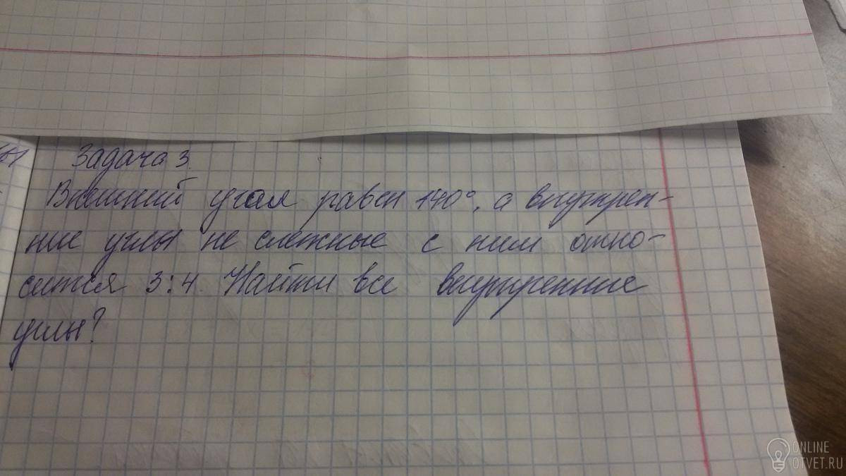 Если внешний угол равен 140 градусов, то смежный с ним угол 180-140=40; дальше составляем уравнение 3х+4х+40=180. Решаем уравнение. х=20, тогда 3х=3*20=60; 4х=4*20=80. Таким образом внутренние углы треугольника равны 40, 60 и 80 градусов.