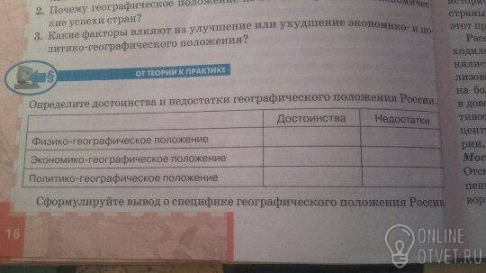 Соседствует с большим количеством стран, имеет выход к разным океанам. Достоинство - выход к основным морским торговым путям, соседство с развитыми странами. Недостаток - основное побережье выходит к Северному Ледовитому океану, маленькое количество незамерзающих портов, удаленность незамерзающих портов от основных торговых путей и экономических центров; сложная политическая ситуация с соседями, обширные границы со слаборазвитыми странами.
