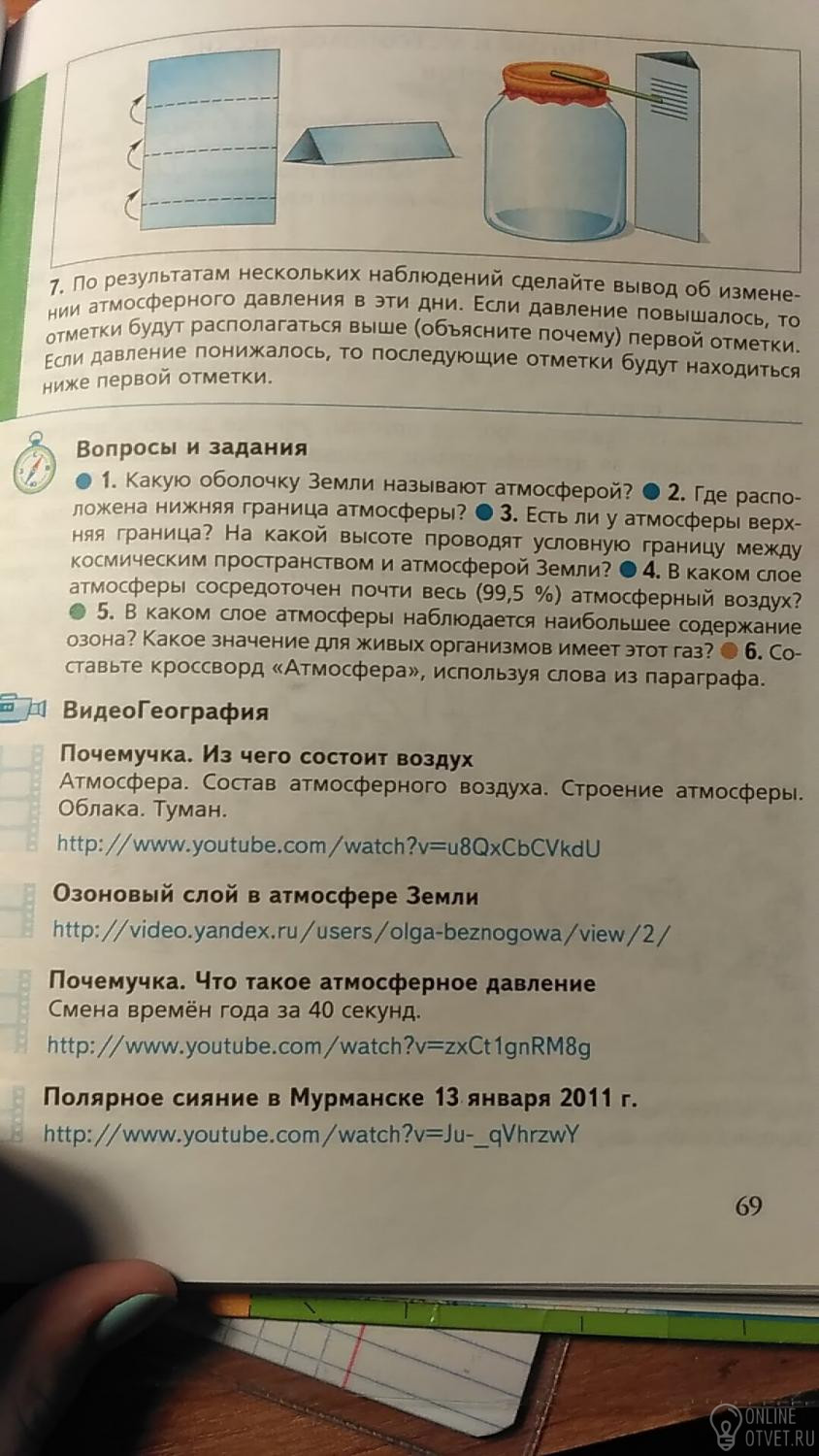 Атмосфера — внешняя газовая оболочка Земли. Ее нижняя граница проходит по литосфере и гидросфере, а верхняя — на высоте 1000 км. В тропосфере сосредоточено около 80 % массы атмосферы, находится почти весь водяной пар, возникают грозы, бури, облака и осадки, а также происходит вертикальное (конвекция) и горизонтальное (ветер) перемещение воздуха.